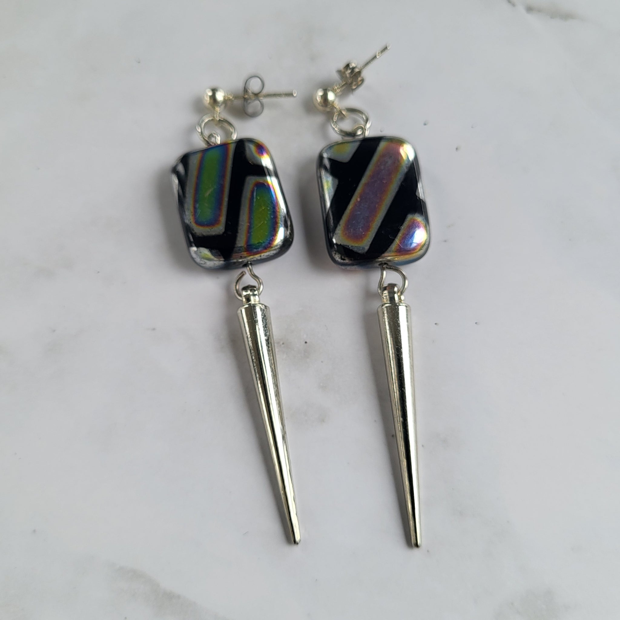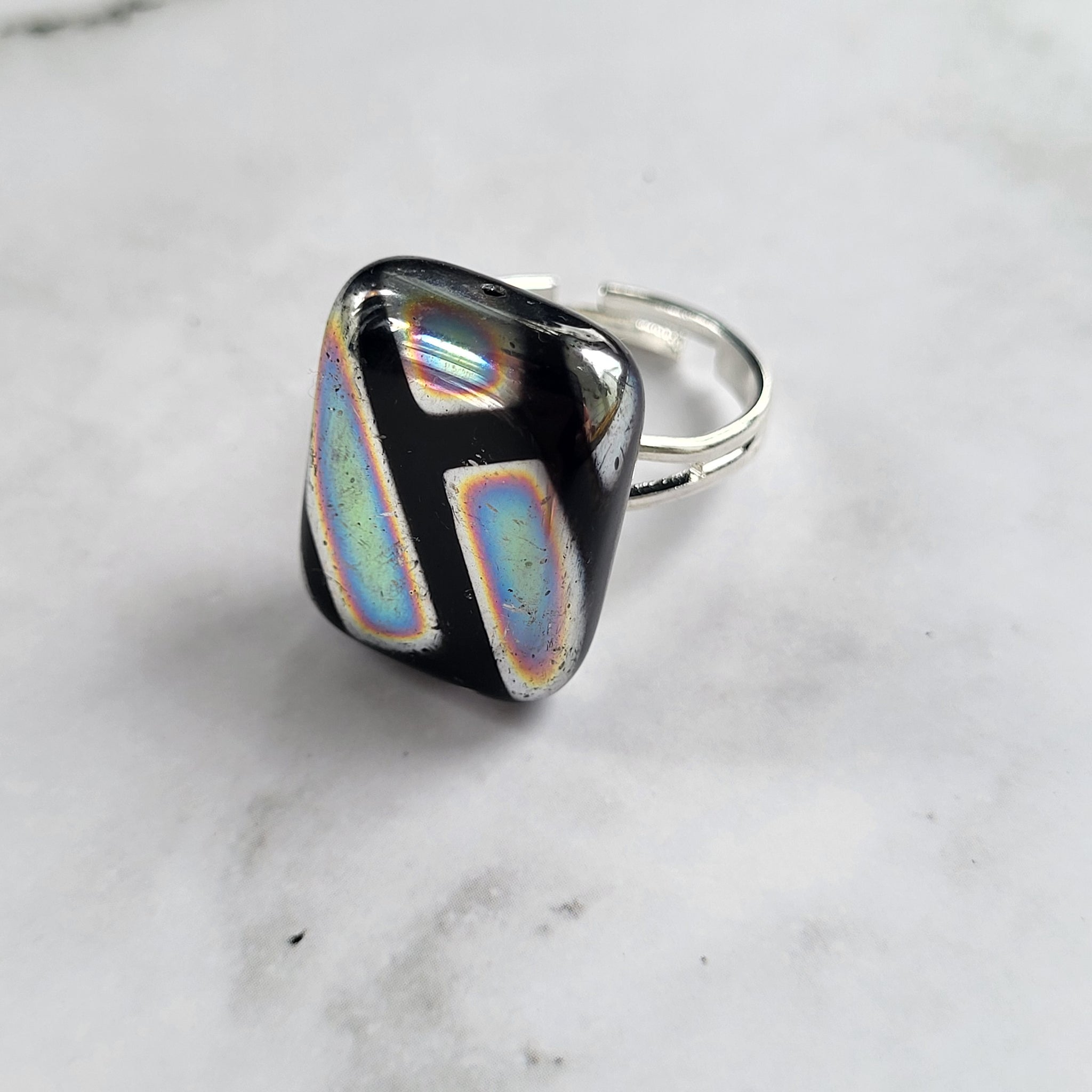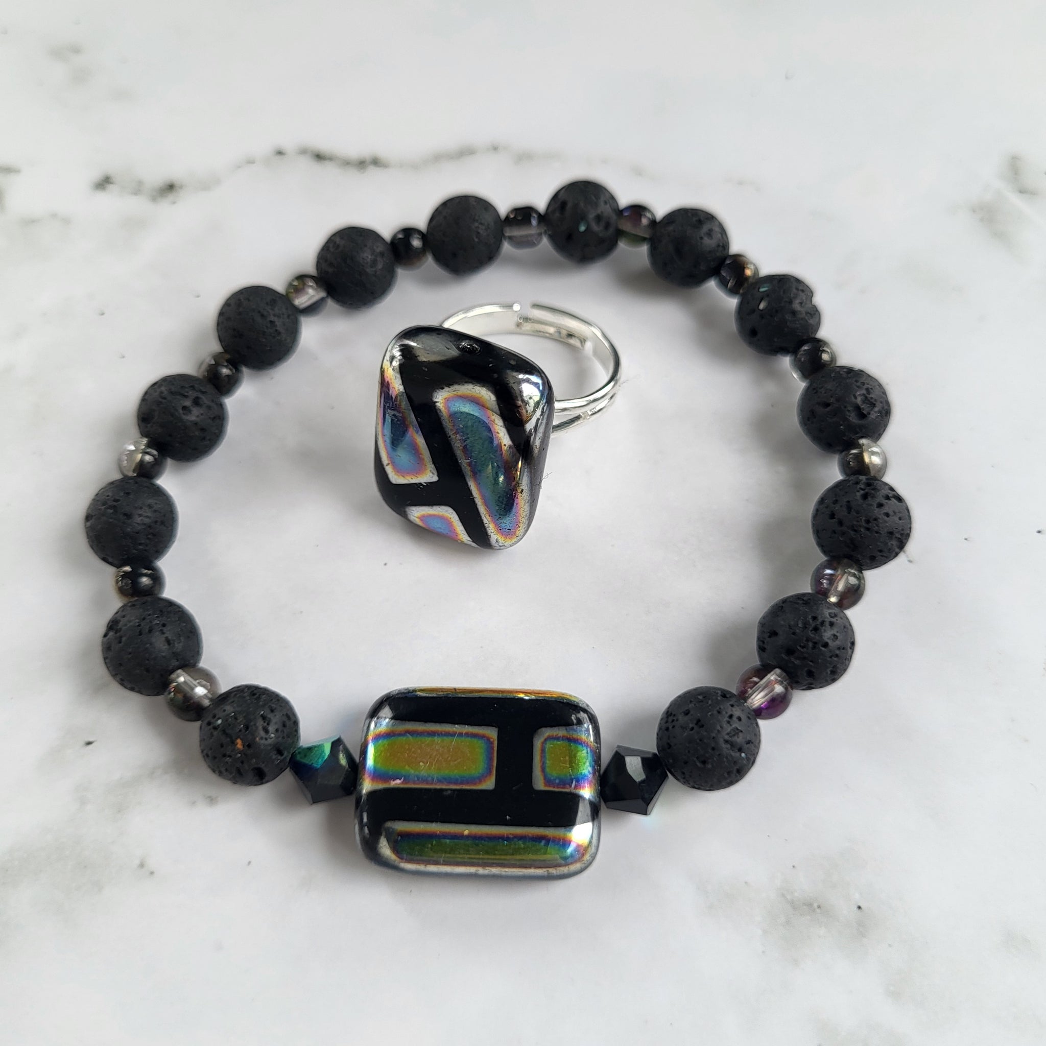 A variety of black and shimmery beads with a rounded rectangular focal bead. Features stud dangle earrings, stretchy bracelets and an adjustable ring. All items sold separately.