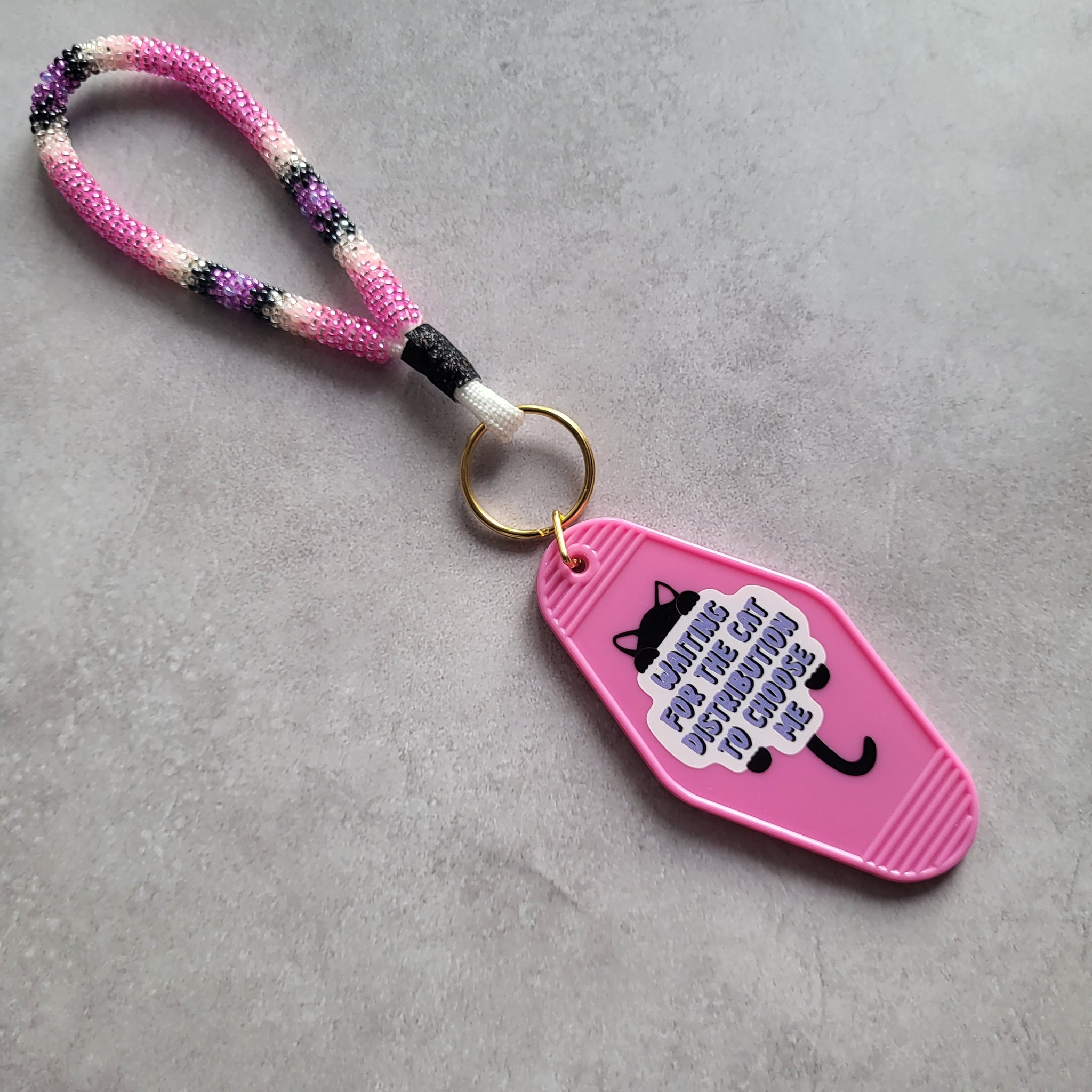 Mini beaded lanyard attached to retro motel keychain. (Cat Keychain one only)