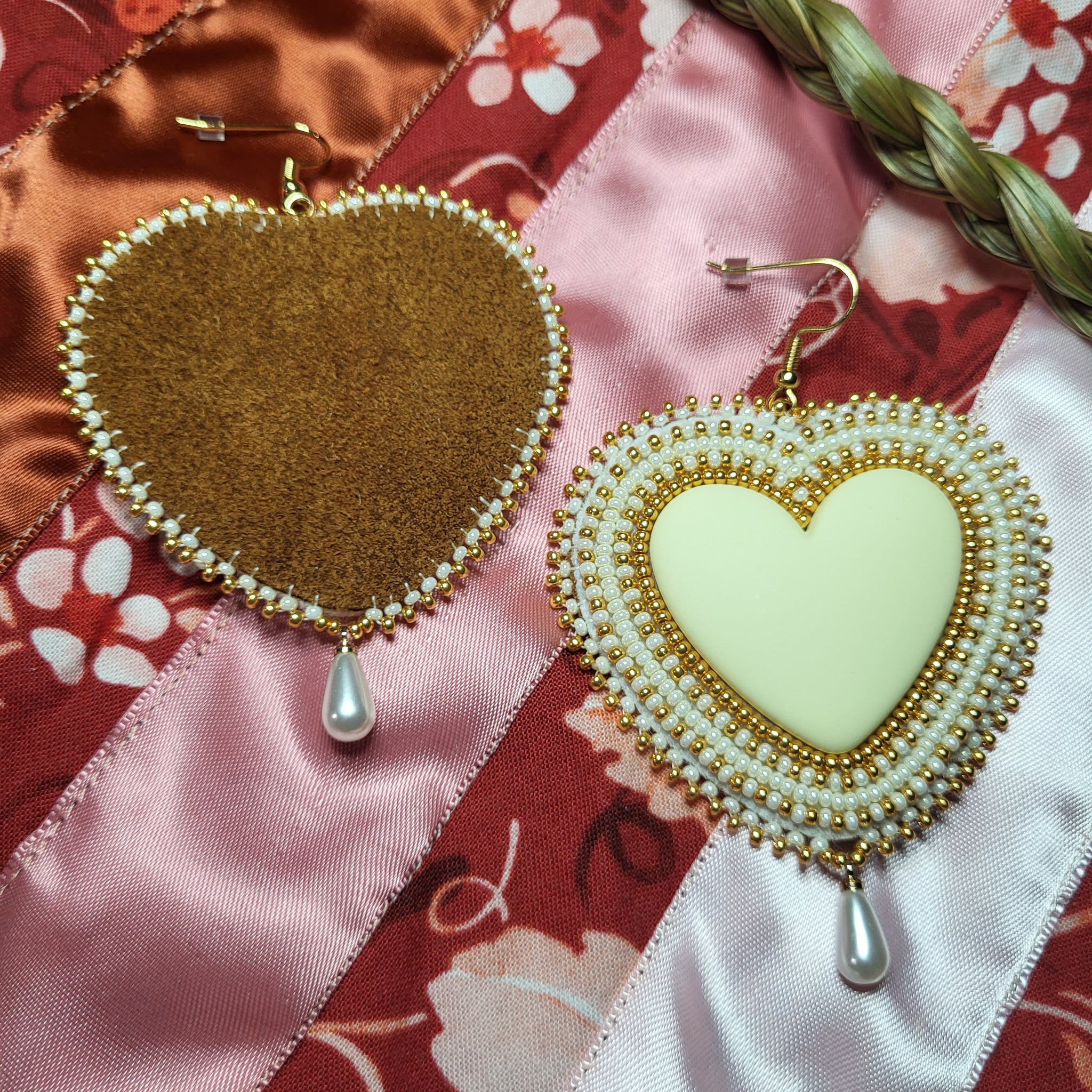 Cream matte centers with cream and gold colored beads. Suede backing and gold fishhook style findings.